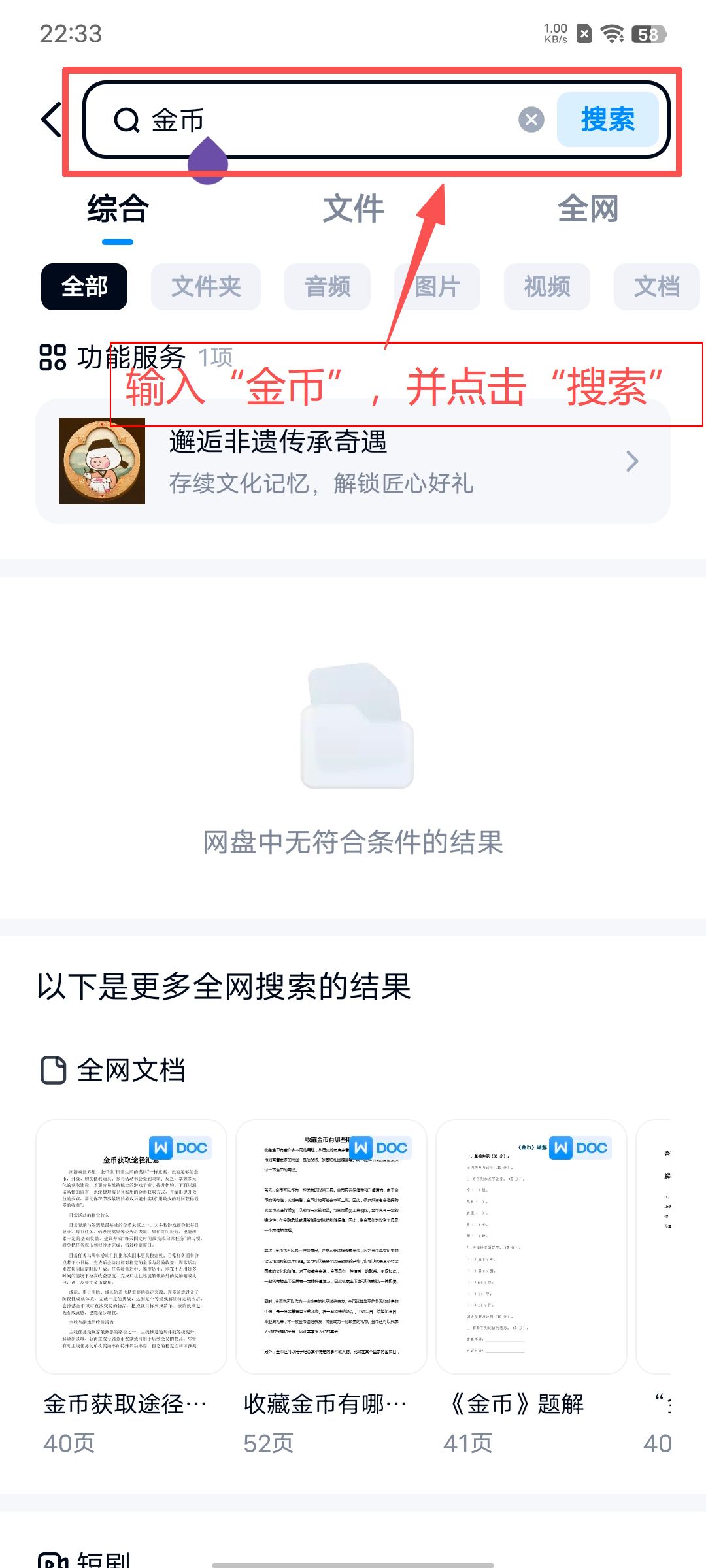 2.在搜索框里直接输入 「金币」 两个字,点击键盘上的搜索按钮