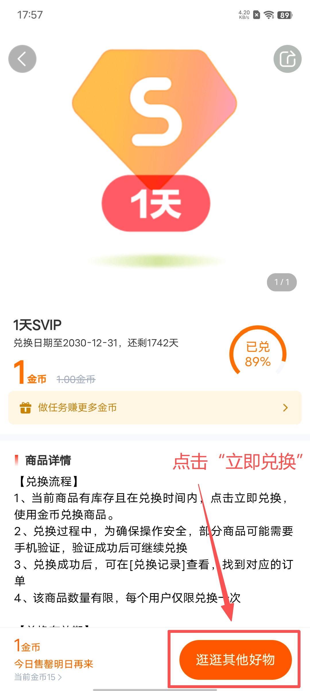 7.根据自己的金币数量,选择1 天 SVIP或7 天 SVIP,点击 「立即兑换」 即可