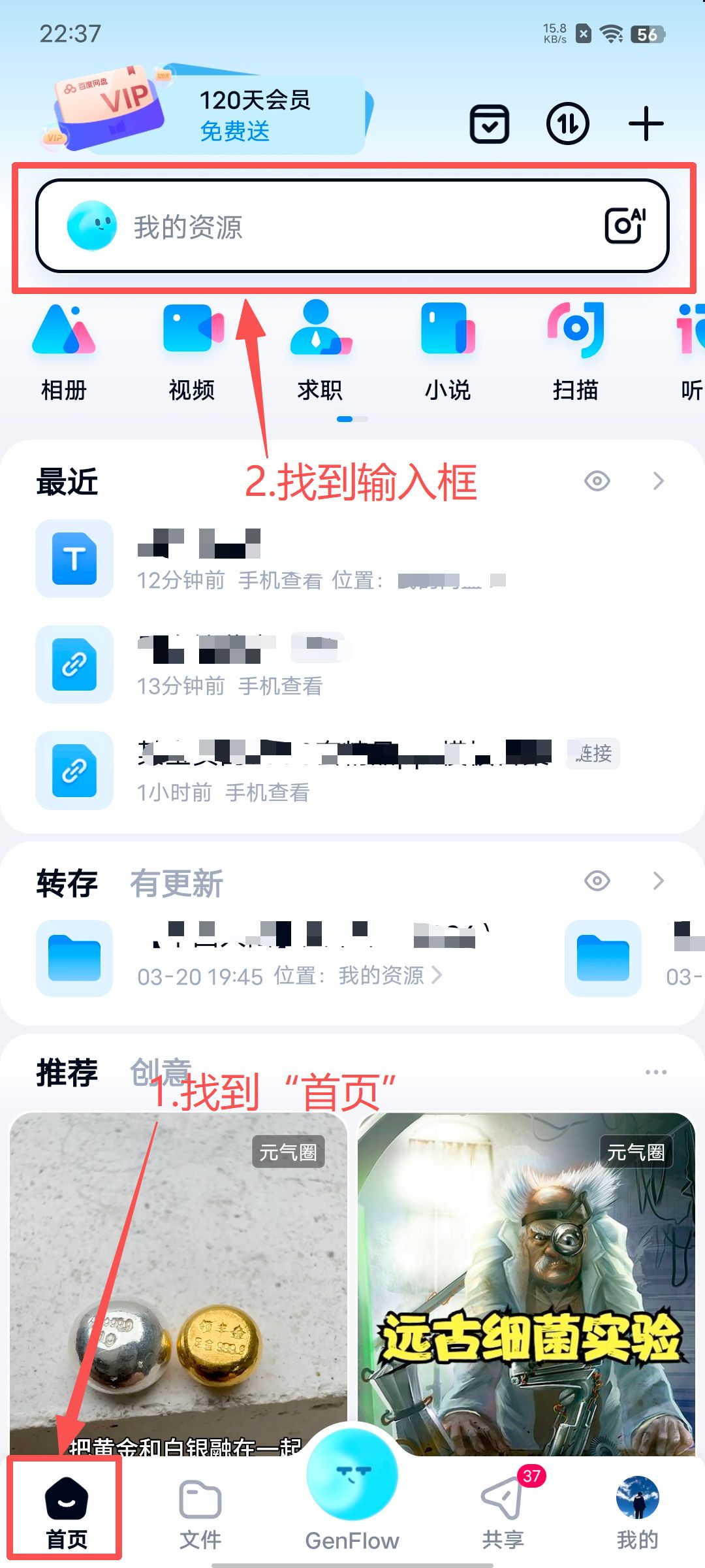 1.打开手机版百度网盘 APP,确保是官方最新版本,先点击底部「首页」,再找到页面最上方的搜索输入框,如下图: